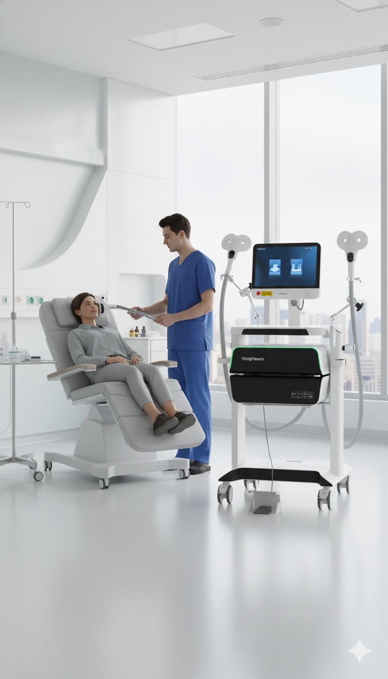 Транскраниальный магнитный стимулятор является диагностическим и терапевтическим оборудованием при различных неврологических и психиатрических расстройствах. Импульсное магнитное поле генерирует индуцированный ток в мозге, который стимулирует соответствующие нейроны мозга и вызывает ряд физиологических и биохимических реакций.